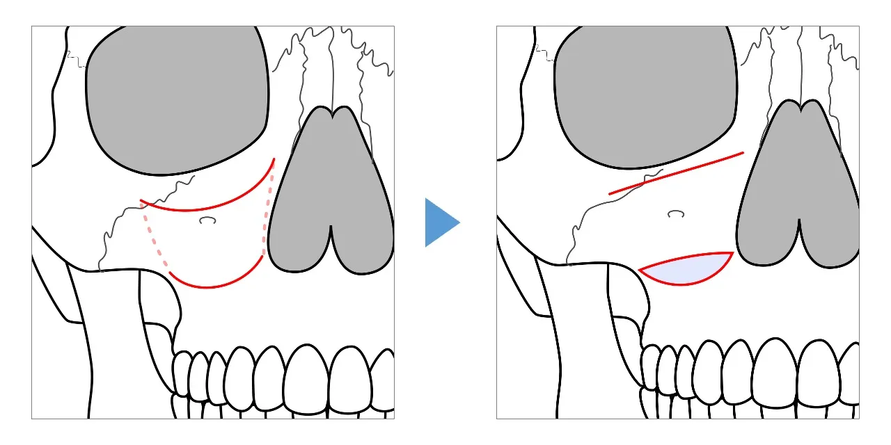 なお、骨膜下ミッドフェイスリフトでは、切ったり剥がしたりする範囲が大きくなることで、表ハムラ単独での手術に比べ、内出血や腫れがより強く生じる可能性があります。