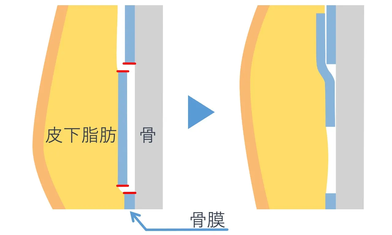 対して骨膜ごと引き上げる方法は、引き上げた位置で骨と骨膜が癒着しますので、明確な効果が出やすく、後戻りも非常に起こりにくい方法となります。