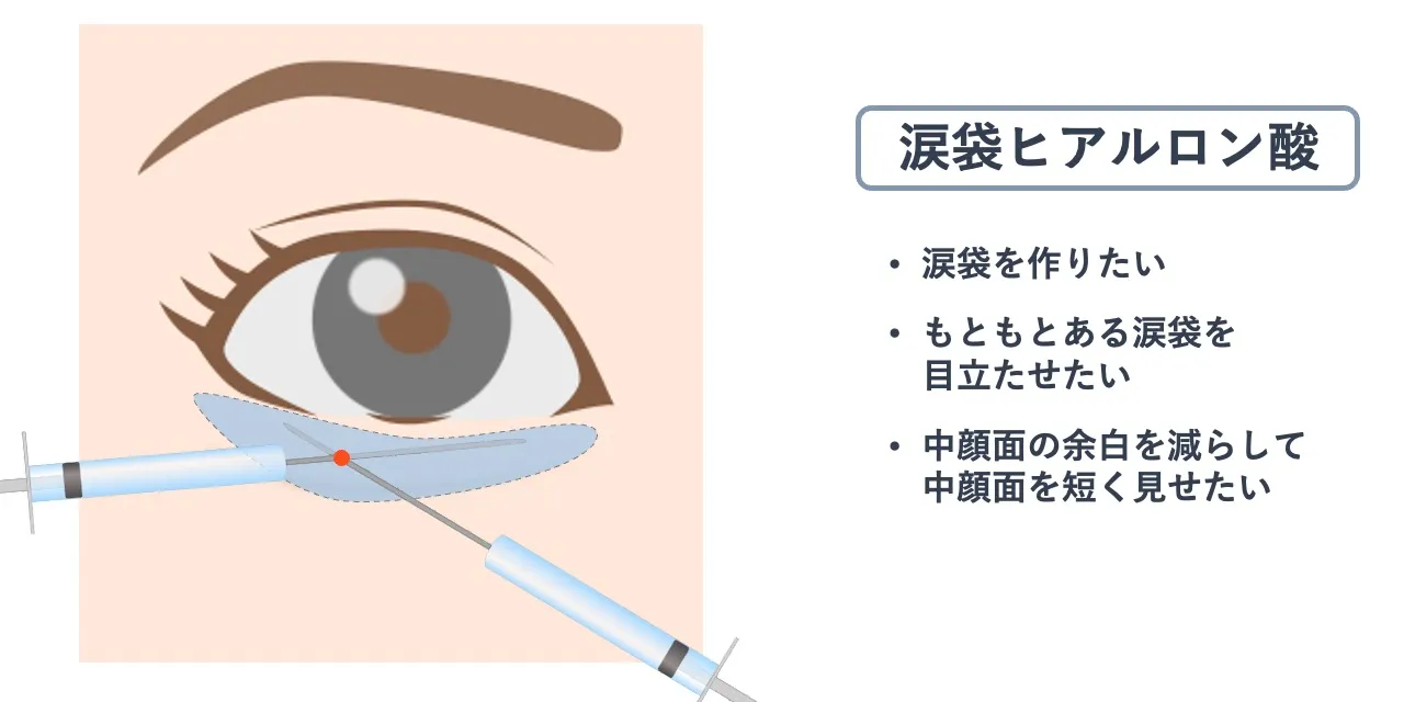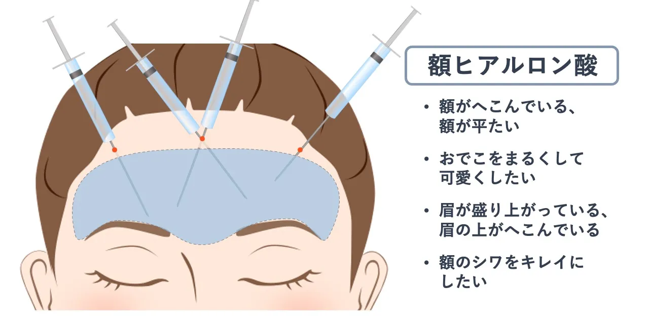 ヒアルロン酸はシワやくぼみを治すアンチエイジングにも、おでこや涙袋、唇などをかわいく仕上げることにも使える、たいへん有能な素材です。