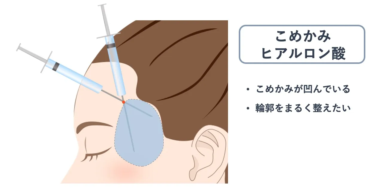 おでこや目尻に刻まれてしまったシワや、深いほうれい線、目の上・目の下のくぼみ、こめかみのくぼみ、頬のコケ感などを改善します。